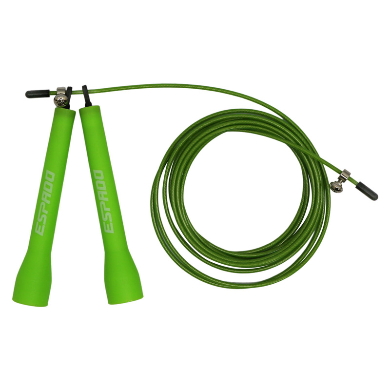 Скакалка Espado ES2142 позволяет совершать двойные и тройные прыжки. Длина регулируется с помощью специального ограничителя. Система скоростного вращения: встроенные подшипники позволяют увеличить темп прыжков и повышают плавность хода шнура. Для безопасности тренировок стальной трос покрыт защитным слоем.