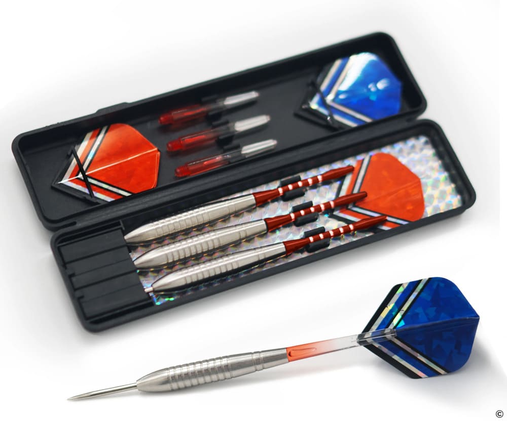 Комплект дротиков для игры в дартс среднего уровня, весом 23 гр. Дротики со стальными иглами для классических мишеней. В комплекте: футляр для хранения, 3 баррели, 3 алюминевых хвостовика, 3 пластиковых хвостовика, 6 оперений. Цвет хвостовиков и оперений в ассортименте.