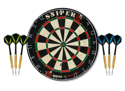 Комплект для игры в дартс SNIPER Summit Play — дартс любительского уровня. Мишень модели Summit Play выполнена из сизаля. Границы секторов разделены круглой проволокой. Лицевая сторона размечена как классический дартс с двадцатью секторами. Такая мишень от Sniper станет хорошей стартовой точкой на вашем пути в мире дартса. В комплект входят 6 дротиков весом 20 гр, с латунным покрытием.