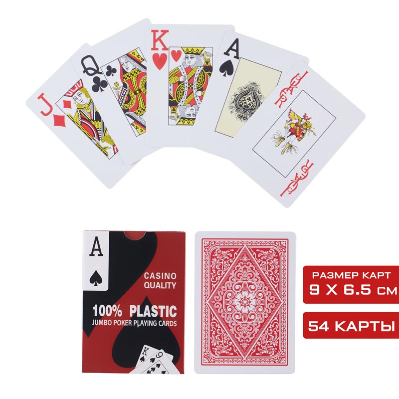 Карты игральные, пластиковые - это высококачественные изделия, которые станут идеальным выбором для любителей карточных игр и фокусов. Колода состоит из 54 уникальных карт размером 6.5 х 9 см и толщиной 28 мкм. В колоде игральных карт есть четыре масти: пики, крести, буби и черви. Каждая масть состоит из 13 карт: туз, король, дама, валет и числовые карты от 2 до 10.