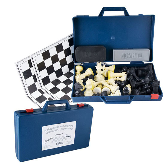 В комплекте: 32 пластиковых шахматных фигур, домино в пластиковом пенале, шашки в пластиковом пенале, 2 игровых поля из картона 30х30 см, кейс