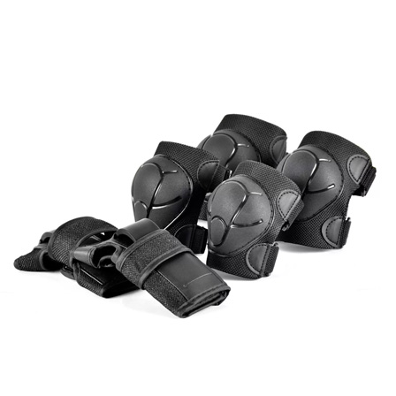 В комплект защитной экипировки входят наколенники, налокотники и защита кисти. Данный комплект предохраняет от ударов и вывихов. Пластиковый каркас и специальная ударопоглощающая вставка снижают риск получения ушибов и ссадин. Легко надевается и крепится при помощи ремней на липучках. Регулируемая система фиксации обеспечивает комфорт, надежность и свободу движений.
