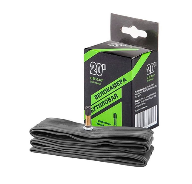 Велокамера 20"x1.95"/2.125" автовентиль, с гайками и шайбой для крепления вентиля к ободу, в индивидуальной упаковке.