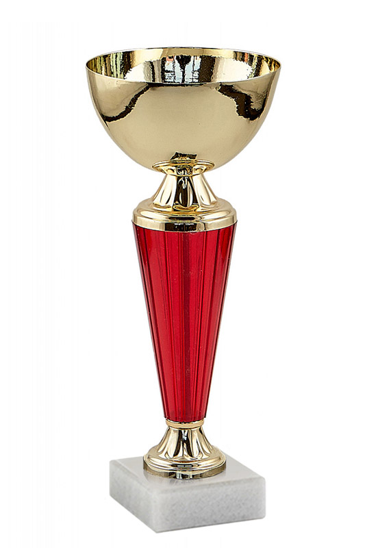 Характеристики:Кубок представлен в трёх ростовках: 21/23/26 см.Чаша металлическая диаметром 80/100/100 мм.Цвет чаши – золото.Стем кубка – пластик, цвет – золото с красным.Постамент – мрамор, цвет – белый/глянцевый.К кубку можно добавить крышку с эмблемоносителем.