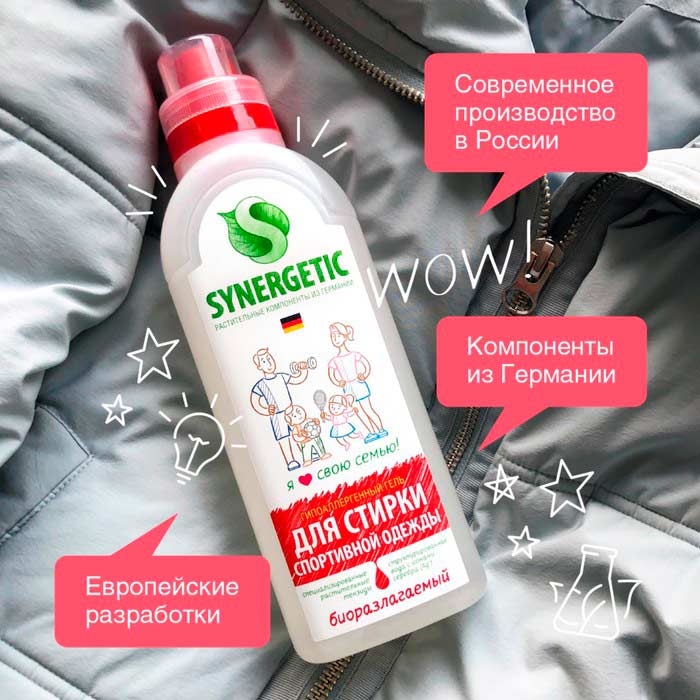 Жидкое средство для стирки Synergetic для спортивных и мембранных тканей, 750мл