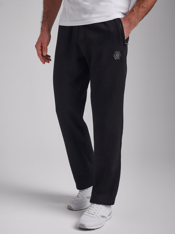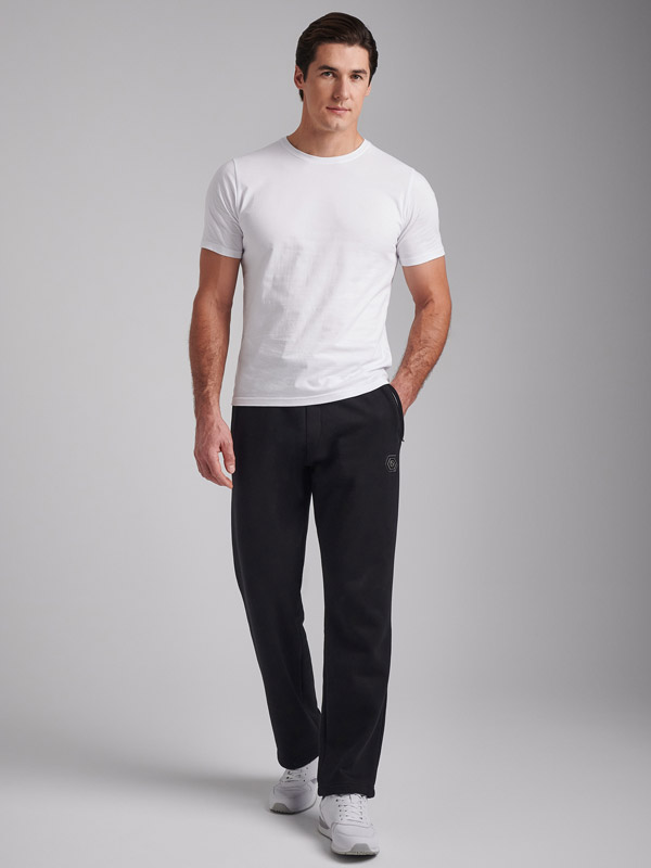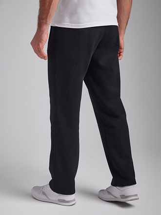 Брюки мужские прямого силуэта из плотного и мягкого хлопкового трикотажного полотна с изнаночным начесом. Карманы с планками, застегиваются на молнии. Под левым карманом настрочен шеврон с фирменным логотипом. Пояс с широкой резинкой, по талии дополнительно регулируется шнурком.