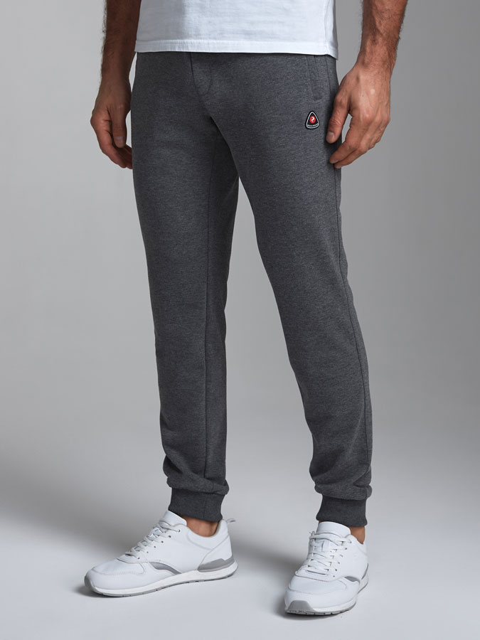 Брюки мужские из хлопкового трикотажного полотна на манжетах из рибаны. На передних половинках карманы с листочкой на молнии. Пояс по талии регулируется шнурком. Под карманом на правой половинке настрочен шеврон с фирменным логотипом.