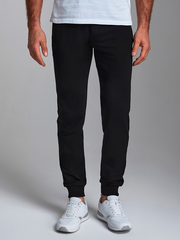 Брюки мужские из хлопкового трикотажа, брючины зауженные книзу, на манжете. Передние карманы прорезные, на молниях, с листочками. Справа есть дополнителный задний карман, так же застегивается на молнию. Ширина пояса брюк регулируется шнуром.