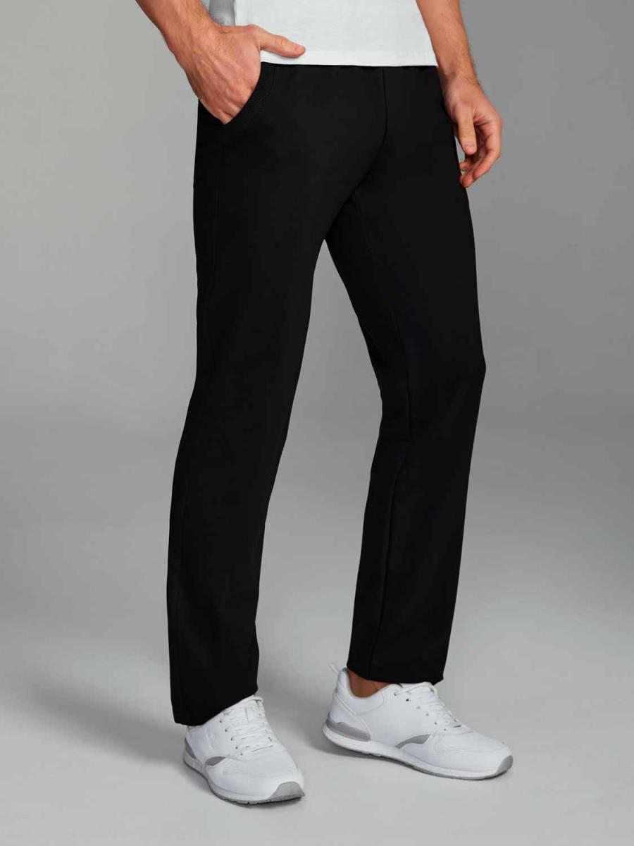 Брюки мужские из хлопкового трикотажа прямого силуэта. Карманы в боковых подрезах, окантованы трикотажной резинкой. Пояс притачной, отстрочен с эластичной резиной, дополнительно регулируется шнурком.