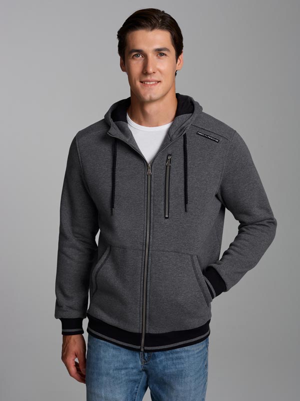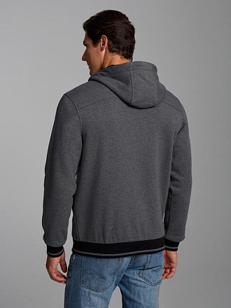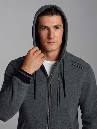 Толстовка мужская из плотного и мягкого хлопкового трикотажного полотна с изнаночным начесом. Изделие на молнии, с капюшоном, внутри капюшона - подкладка из клетчатой ткани. Спереди на изделии большие накладные карманы, слева на груди карман на молнии. По низу толстовки и низу рукавов пришита вязанная декоративная резинка.