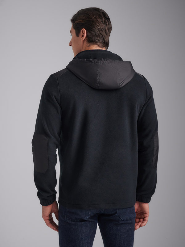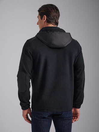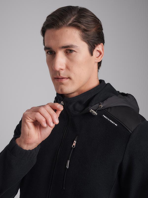 Толстовка мужская из флиса с капюшоном. Низ куртки и низ рукавов выполнены с эластичной рибаной. Толстовка с накладными карманами "кенгуру". Рукава "реглан". По всем швам выполнена отделочная строчка. По низу толстовки расположен, вдоль шва притачивания пояса настрочен шеврон с фирменным логотипом. В капюшоне расположены декоративные шнуры.