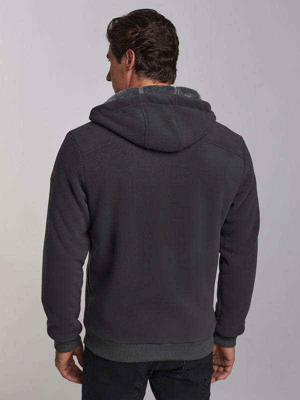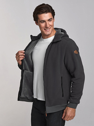 Толстовка мужская из плотного флиса, дублированного мехом. Толстовка с капюшоном. Карманы прорезные с открытыми молниями. Низ куртки заужен трикотажным поясом. Рукава втачные, низы рукавов с манжетами. На левом рукаве шеврон с фирменным логотипом.