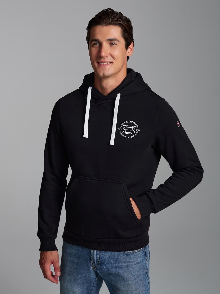 Толстовка мужская из плотного трикотажного полотна, без застежки. Куртка прямого силуэта, с капюшоном, рукав втачной. Карманы типа "кенгуру". По краю капюшона проходит широкий плетеный шнур. Логотип вышит на полочке.