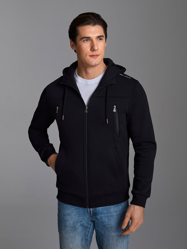 Толстовка мужская из плотного и мягкого хлопкового трикотажного полотна с изнаночным начесом. Капюшоном с подкладкой из кулирного полотна. Манжеты по рукавам и пояс толстовки из рибаны. На полочке и спинке отрезные кокетки. Карманы выполнены в отрезных деталях полочки с листочками без молний. На обоих полочках выполнены прорезные вертикальные нагрудные карманы с открытыми молниями. На полочках, с внутренней стороны, подкладка из кулирного полотна.