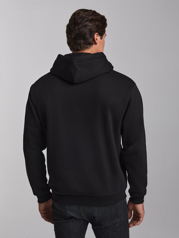 Толстовка мужская из плотного трикотажного полотна, без застежки. Куртка прямого силуэта, с капюшоном, рукав втачной. Карманы типа "кенгуру". По краю капюшона проходит широкий плетеный шнур. Логотип вышит на полочке.
