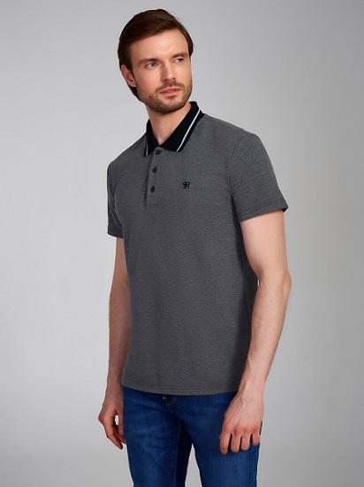Футболка-поло из хлопкового полотна "пике". Классическая модель поло с короткими рукавами. Воротник и манжеты рукава выполнены из трикотажной рибаны темно-синего цвета с белой полосой. На полочке застежка-планка на пуговицах. На полочке вышивка "R". По низу футболки в боковых швах выполнены разрезы, обработанные тесьмой.