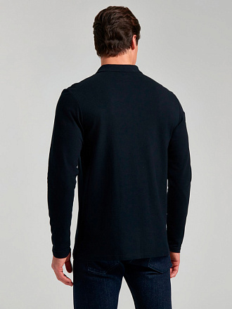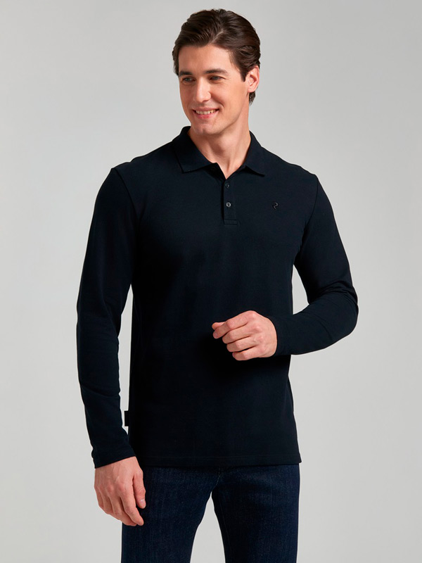 Футболка-поло из хлопкового полотна "пике". Модель поло лонгслив с длинными рукавами. Воротник выполнен из трикотажной рибаны темно-синего цвета. На полочке застежка-планка на пуговицах. На полочке вышивка "R". По низу футболки в боковых швах выполнены резрезы, обработанные тесьмой. В боковом шве распложен жаккардовый флажок "Red N Rocks"