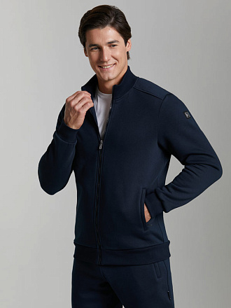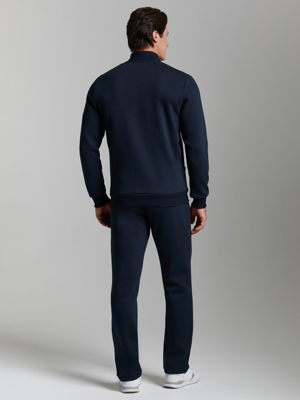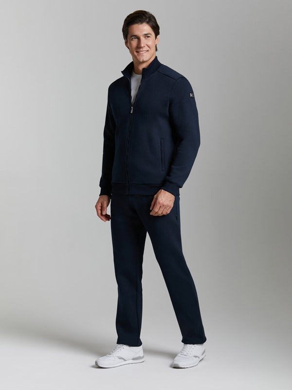 Мужской артикул 12M-RR-1830 темно-синего цвета спортивный спортивный костюм из хлопкового трикотажного полотна с изнаночным начесом. Костюм состоит из удобной куртки на поясе, с воротником-стойкой, куртка застегивается на молнию. Рукава втачные. На рукаве слева настрочен фирменный шеврон с металлическим логотипом. Пояс, воротник и манжеты куртки изготовлены из эластичного полотна. Карманы куртки и брюк застегиваются на молнии. Брюки прямого силуэта, слегка заужены книзу. Пояс брюк по линии талии с эластичной резинкой, дополнительно регулируется шнуром. Костюм создан для комфортного отдыха и тренировок в прохладное время года.