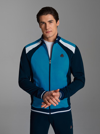 Костюм мужской из хлопкового трикотажного полотна. Модель выполнена в красочном дизайне: органично подобраны цвета. Куртка на молнии с воротником, с прорезными карманами с листочкой, воротник, низ куртки и рукавов обработаны трикотажной рибаной из хлопка для плотного прилегания к телу.
