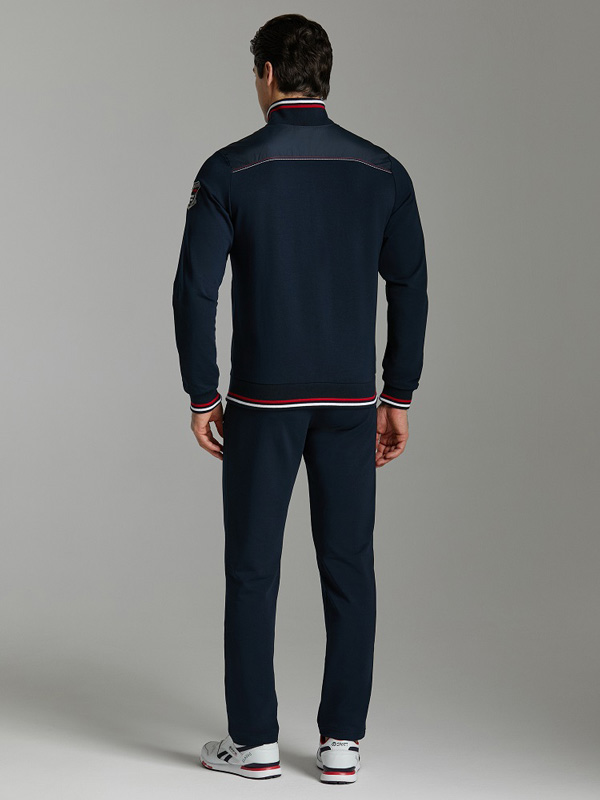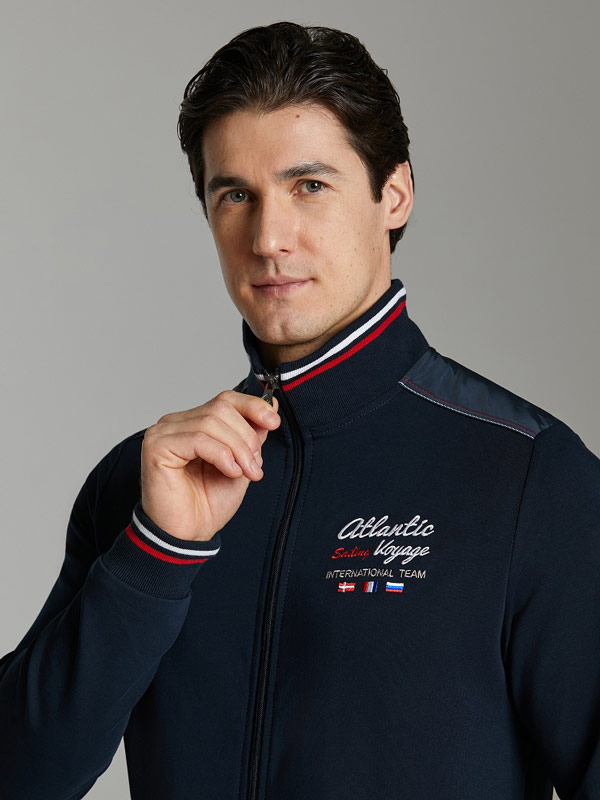 Спортивный костюм из хлопкового трикотажного полотна. Куртка с центральной застёжкой на молнии. Карманы на куртке расположены в швах отрезных бочков, на листочке с молнией. Рукава втачные с отрезными вставками. Отрезные кокетки декорированы плащевой тканью. Посадку по фигуре обеспечивает эластичная рибана по поясу и манжетам. Воротник из основной ткани из двух частей, контрастного цвета. Брюки прямые с боковыми карманами без молний. На задней правой половине брюк выполнен прорезной карман с листочкой на молнии. Пояс по линии талии регулируется шнурком. На левом рукаве и левой половине брюк настрочен шеврон с фирменным логотипом и расположена вышивка "Yachting". На правой полочке стильная вышивка "Atlantic". На левой полочке вышивка "Yachting Navigation".