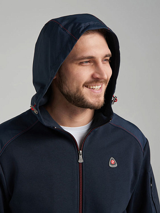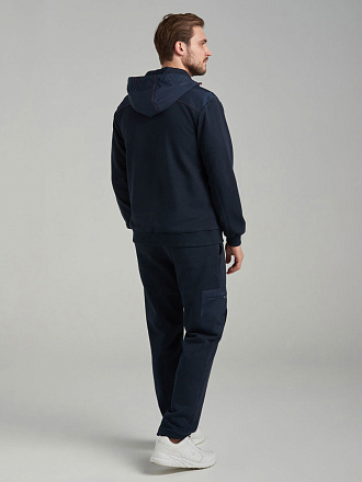 Мужской спортивный костюм из плотного хлопкового трикотажа с петельной изнанкой. Комплект выполнен в стиле «Яхтинг», который подчеркивается яркой вышивкой, контрастными отделочными строчками и деталями из плотной водонепроницаемой ткани. Куртка свободного силуэта на поясе, с удобным капюшоном, рукава втачные. На изделии много модных функциональных деталей. Капюшон, кокетка , карман на левом рукаве и объемный накладной карман брюк выполнены из темно-синей плащевки. Куртка так же имеет удобные карманы.
