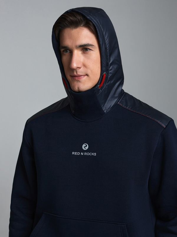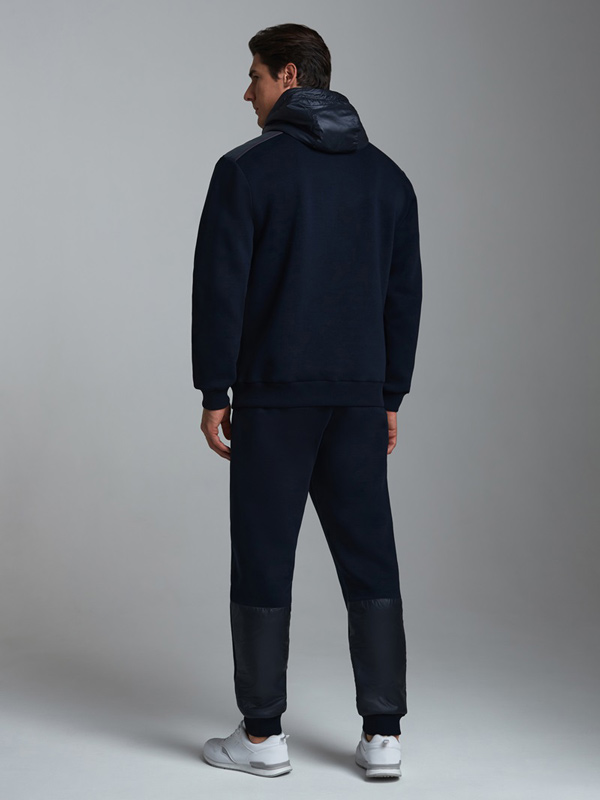 Спортивный костюм с капюшоном, из трехниточного плотного трикотажа с начесом по изнанке. Куртка-худи прямого силуэта. Рукава втачные со спушенной линией плеча. Кокетки куртки, капюшон и нижняя часть задней брючины продублированы водонепроницаемой плащевкой. Карманы накладные "кенгуру". Манжеты рукавов и брючин и пояс куртки из эластичного трикотажа. Брюки с прорезными карманами на молниях, Низ брюк заужен анжетами. Пояс брюк по линии талии с эластичной тесьмой, дополнительно регулируется шнуром.На груди и на брюках под карманом - термотрансфер с фирменным логотипом.