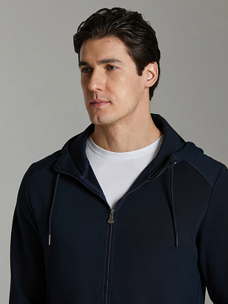 Современная модель мужского костюма из жаккардового трикотажного полотна. Куртка с капюшоном, на молнии, с карманом-кенгуру. Рукава покроя реглан, выполнены из контрастного трикотажного полотна. По низу куртки слегка заужен поясом, рукава с манжетами. Карманы брюк прорезные, наклонные. Низ брюк с манжетами. Пояс брюк эластичный, дополнительно регулируется шнуром. На слева на груди и на левой брючине под карманом - фирменный логотип. На правый рукав логотип нанесен методом термопечати.