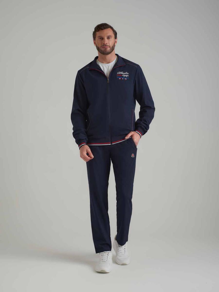 Мужской спортивный костюм изготовлен из легкой эластичной плащевой ткани. Куртка на молнии прямого силуэта на трикотажном поясе, с воротником-стойкой, на сетчатой подкладке. Рукава втачные, с трикотажными манжетами. Эластичное трикотажное полотно воротника, пояса и манжет с красной и белой полосами. Слева на груди куртки яркая вышивка в морском стиле. Карманы куртки затягиваются на молнии. Брюки прямого силуэта, без подкладки. Спереди на брюках прорезные карманы так же застегиваются на молнию. Пояс брюк выполнен с широкой эластичной резиной, дополнительно фиксируется шнуром. На левом рукаве и под левым карманом брюк - шеврон с фирменным логотипом.
