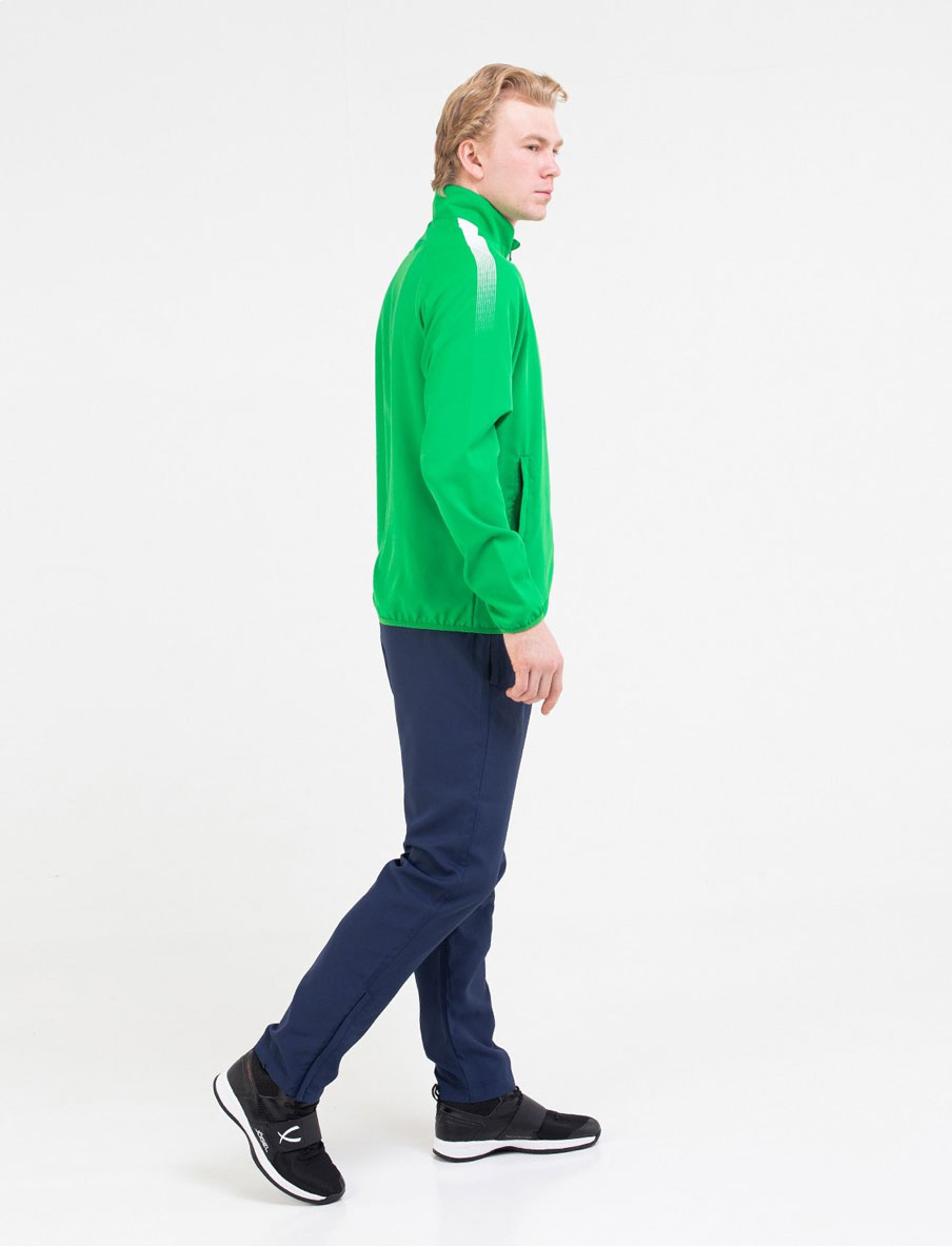 Эффектная куртка ярко-зеленого цвета украшена динамическим паттерн-принтом в виде шестиугольников с имитацией градиента, расположенным в зоне плеч. Брюки классического кроя внизу дополнены застежками на молнии, с помощью которых можно регулировать ширину по низу. Они прекрасно сидят благодаря поясу на эластичной резинке и внутреннему шнуру.