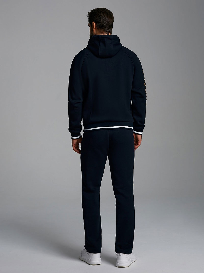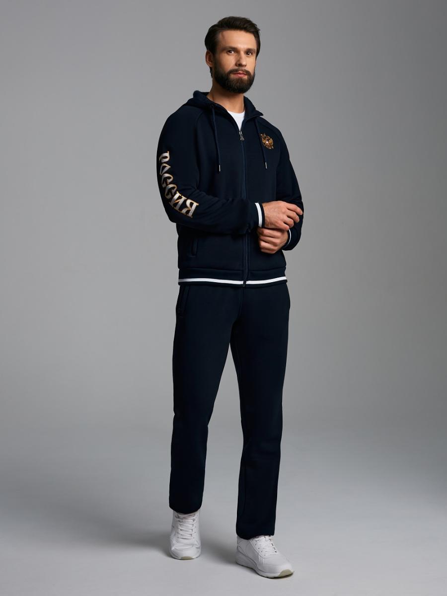 Спортивный костюм из трехниточного трикотажа с начесом по изнанке. Куртка с капюшоном со шнурком в цвет основной ткани. Карманы на куртке и брюках прорезные с листочкой на молнии. Посадку по фигуре обеспечивает эластичная рибана по поясу и манжетам.