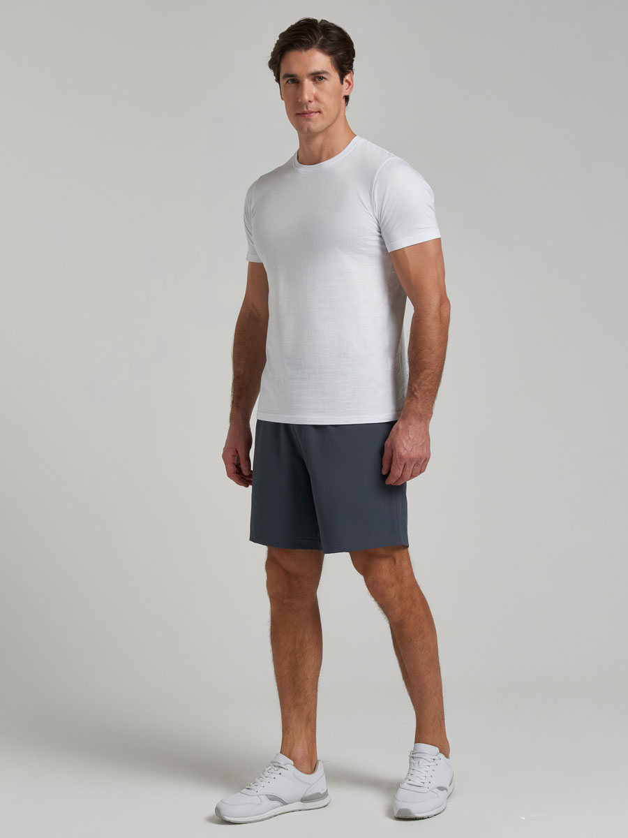 Классические мужские шорты из легкой эластичной плащевки. В боковых швах обработаны карманы. Пояс шорт по талии регулируется шнуром.