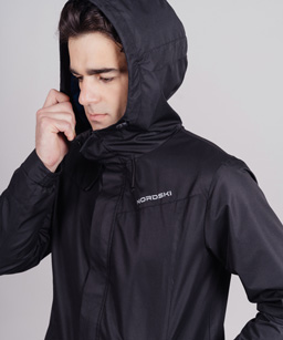 Несъёмный капюшон утягивается в 2х направлениях. Вокруг лица при помощи эластичного шнурка с зажимом-стоппером. Высокий воротник и резинки на нижней части рукавов уберегают от попадания под одежду ветра.