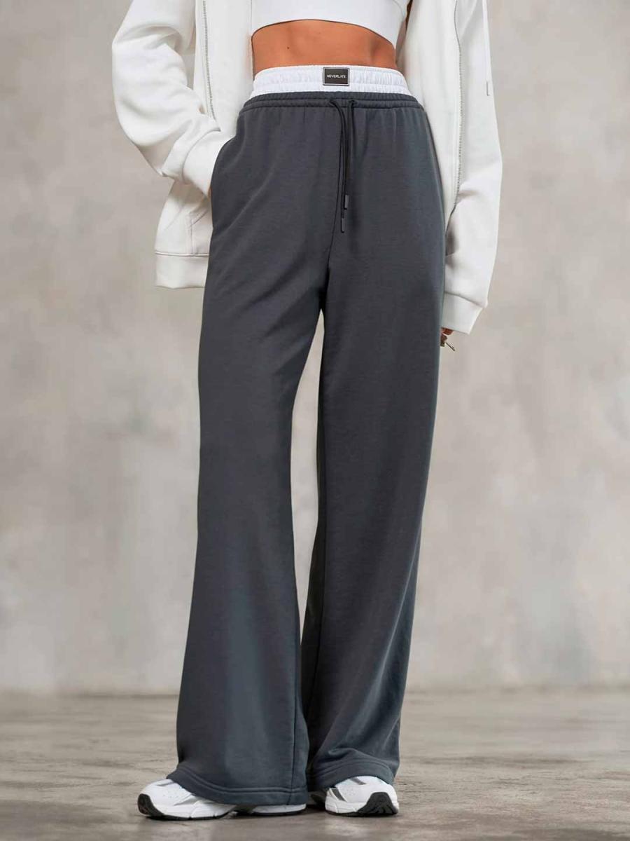 Высокая посадка, свободный силуэт. Двойной пояс, на нижнем поясе брендированная фактурная нашивка. В верхний пояс через петли втянут шнур. Глубокие карманы в боковых швах брюк, по входу в карман есть закрепки. Футер 3х-нитка. Трикотажное полотно премиального качества.