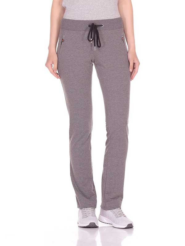 Брюки женские из хлопкового трикотажа приталенного силуэта. Карманы выполнены в шве отрезного бочка с потайными молниями. На задней половине брюк выполнены отрезные кокетки. Пояс выполнен из эластичной трикотажной рибаны на шнурке через люверсы.
