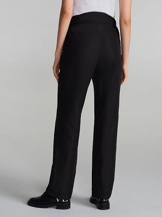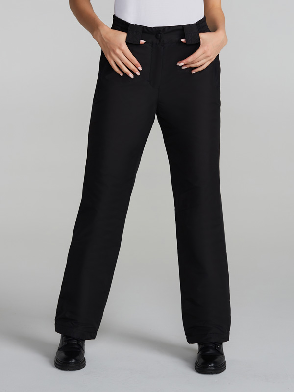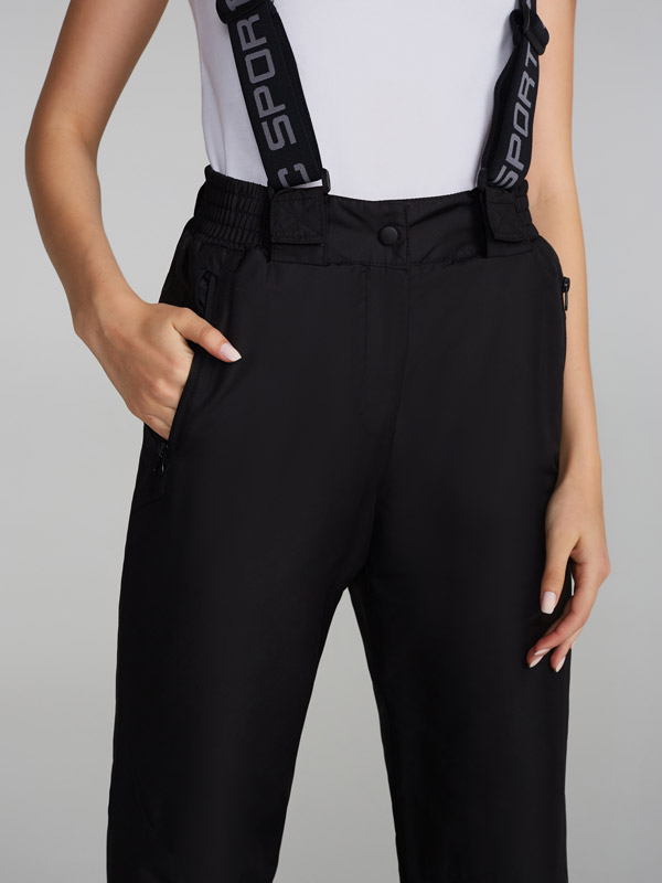 Женские зимние утепленные брюки на бретелях соединенных с отстегивающейся спинкой на молнии. Изготовлены из прочного и водоотталкивающего материала. Подкладка выполнена из флиса, что создает дополнительную воздушную прослойку для поддержания температурного режима. На передних половинках выполнены прорезные карманы с открытой молнией. Застежка на молнии с фиксатором и кнопкой-крючком на поясе. На поясе расположены "шлевки" для ремня.