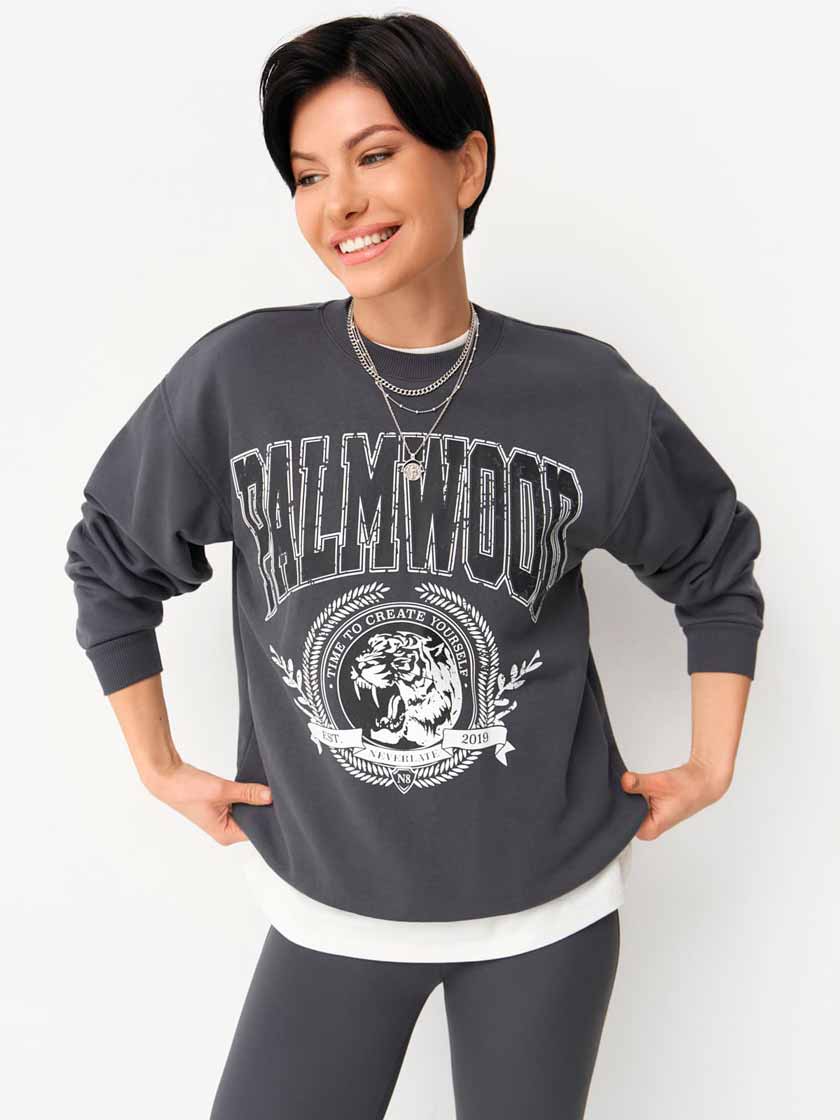 Свитшот свободного силуэта не стесняет движения и смотрится выигрышно как в образе для тренировки, так и в повседневных образах с джинсами или платьями. Модель со спущенной линией плеча выполнена из приятного к телу и простого в уходе трикотажного футера трехнитка.