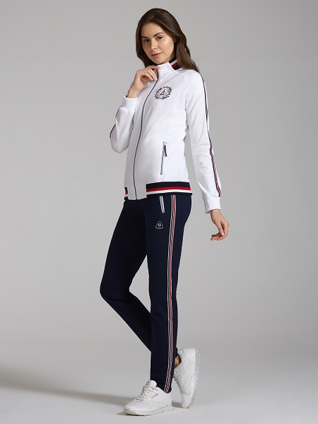 Спортивный костюм выполнен из хлопкового трикотажного полотна. Куртка на молнии, с воротником. Рукава покроя реглан Пояс куртки и воротник выполнены из эластичного полотна с полосами. Карманы в куртке в рельефах, с молниями. Слева на груди вышивка. на рукавах и брючинах сбоку настрочена трехцветная лампасная тесьма. Брюки зауженные. Пояс брюк из эластичной рибаны. Ширина пояса дополнительно фиксируется шнуром. Боковые карманы брюк с молниями. На левом рукаве, в области манжета и на левой половине брюк нанесен термотрансфер с фирменным логотипом.