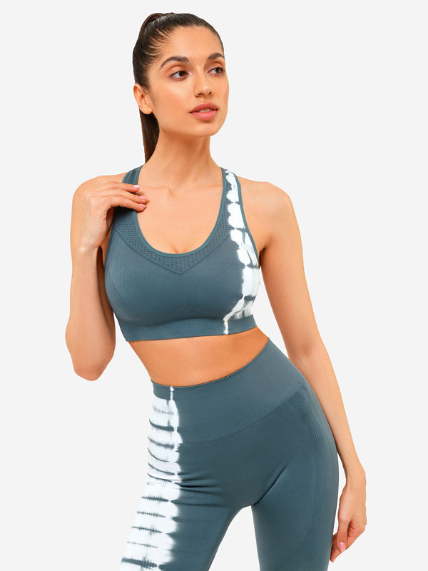 Бесшовный спортивный бра с уникальным "вареным" эффектом. Окрашивание в технике тай - дай выполнено с разных сторон бра и имеет уникальный рисунок. Бра средней степени поддержки, классическая форма с плавным глубоким вырезом и спиной - боксеркой. Уникальный дизайн также достигается за счет вывязанных декоративных элементов различной текстуры.