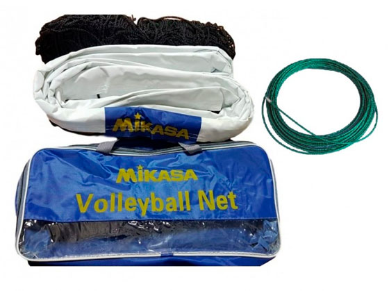 Сетка волейбольная с тросом MIKASA, черная, размер 9.5*1 м, длина троса 12,5 м. Обшита сверху белой стропой. Ячейка 100*100мм. В чехле на молнии.