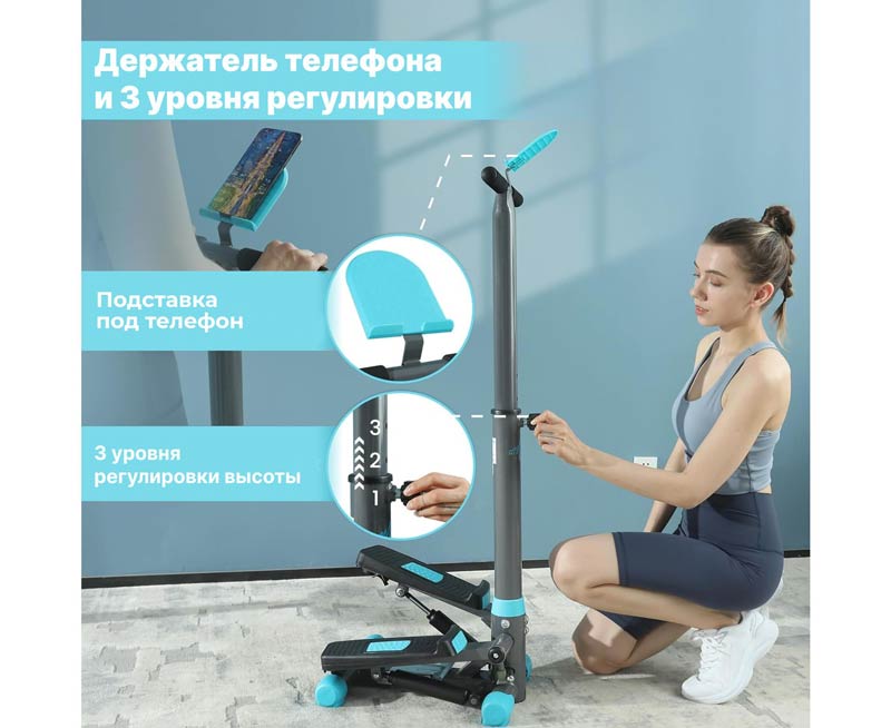 Максимальная нагрузка на степпер тренажер составляет 100 кг. Гидравлическая система нагрузки обеспечивает плавные и бесшумные движения, снижая нагрузку на суставы. Вы можете регулировать интенсивность своей тренировки, меняя скорость/темп шага. Механизм простой: чем быстрее вы шагаете, тем интенсивнее ваша тренировка. Регулируемая высота поручня на 3 уровня подойдет для комфортной тренировки пользователей разного роста.