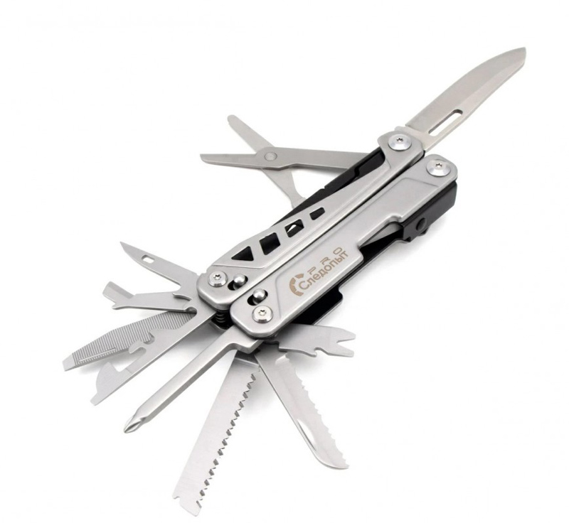 Мультитул «СЛЕДОПЫТ Pro» - набор из 15 предметов профильного или повседневного инструмента, заключенный в одном компактном корпусе. Имеет фиксаторы, которые предотвращают самопроизвольное складывание инструментов. Оснащен зажимом для крепления на ремне. Армированный чехол в комплекте.