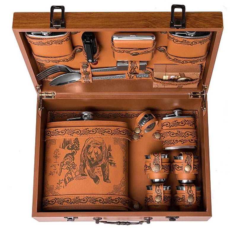 Подарочный набор в деревянном чемодане. Поверхность чемодана покрыта лаком, нанесен рисунок и узор. Чемодан закрывается на защелки, имеет удобную ручку. Внутри крышка чемодана оснащена фиксаторами на кнопке для предметов набора. Имеется дополнительный фиксатор, предназначенный для салфеток*.