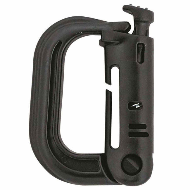 Для автоматического защелкивания замка в конструкции карабина используется пружина. Имеется крепление для установки карабина на стропу или систему Molle.