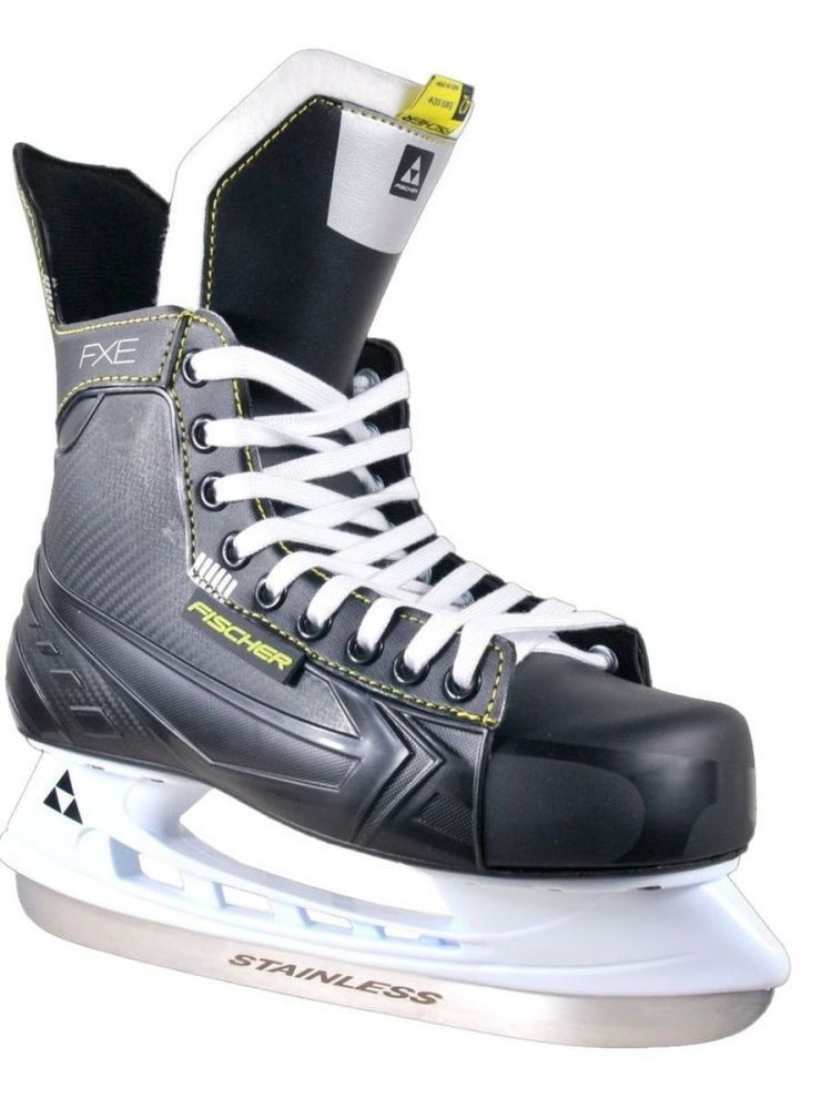 Коньки хоккейные Fischer FXE SR H07421. Хоккейные коньки для взрослых. Любительский уровень. Цельно - литой ботинок, легкие и удобные. Материал: нейлон, ПВХ, текстиль, нержавеющая сталь. Взрослые коньки для мужчин для игры в хоккей. Коньки надёжно защищают стопу и лодыжку от возможных травм во время игры или тренировки, удара клюшки, мяча или шайбы.